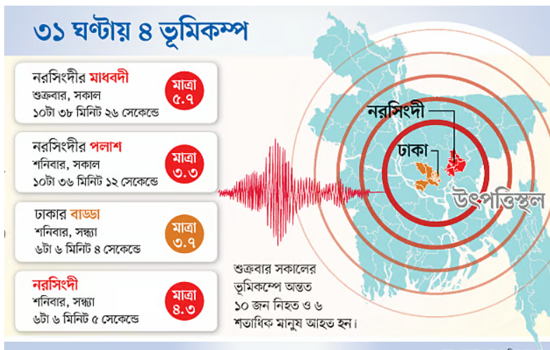 গত শুক্র ও গতকাল শনিবার প্রায় ৩১ ঘণ্টার মধ্যে ঢাকা ও এর আশপাশে চারটি ভূমিকম্পের ঘটনা এমন ঝুঁকির বিষয়টি সামনে এনেছে। এর মধ্যে শুক্রবার সকালে ঢাকা থেকে প্রায় ২৫ কিলোমিটার দূরে রিখটার স্কেলে ৫ দশমিক ৭ মাত্রার ভূমিকম্পটির উৎস ছিল নরসিংদীর মাধবদী। উৎপত্তিস্থলের গভীরতা ছিল ভূপৃষ্ঠ থেকে ১০ কিলোমিটার গভীরে।
