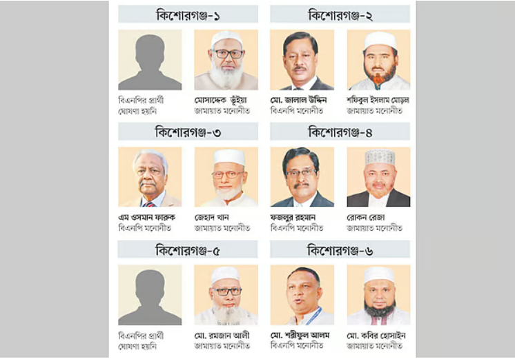 কিশোরগঞ্জের ছয়টি সংসদীয় আসনের মধ্যে দুটিতে এখনো প্রার্থী ঘোষণা করেনি বিএনপি। ফলে অঘোষিত কিশোরগঞ্জ-১ ও কিশোরগঞ্জ-৫ আসনে দলের মনোনয়নপ্রত্যাশী অন্তত ১৬ নেতা বেশ তৎপর। এলাকায় নিয়মিত সভা-সমাবেশ, মিছিলসহ নানা কর্মসূচি করে যাচ্ছেন তাঁরা। যদিও একটি আসন বিএনপির যুগপৎ আন্দোলনের শরিক কোনো দলকে ছেড়ে দেওয়ার আলোচনা আছে।